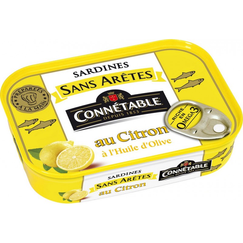 Vous qui ne mangez pas les arêtes des sardines, mais qui raffolez du savoureux mélange de la sardine confite à l'huile d'olive et au citron, cette sardine sans arêtes est faîtes pour vous! Ces sardines généreuses à la chair fondante sauront ravir tous les amateurs de sardines, même les plus exigeants! SARDINES, huile d'olive vierge extra, citron 3%, sel. Produit unitaire EAN 3263670126211.