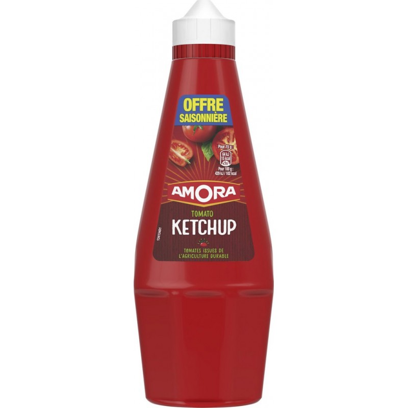 Découvrez le ketchup Nature Amora et son flacon souple de 575 g. Une recette faite à partir de tomates juteuses, mûries en plein champ et sélectionnées pour leur qualité et leur saveur. Les Ketchups Amora® vous aideront à rehausser le goût de vos poêlées de légumes, de vos pâtes, de vos marinades ou de vos farces à base de viande. De plus, les Ketchups Amora® sont sans conservateur. Parce qu'il est important pour nous de limiter notre impact environnemental, les bouteilles de nos ketchups deviennent transparentes pour être 100% recyclables*. Aidez-nous à réduire les déchets plastiques en les recyclant. *Hors opercule. Présente dans le cœur des Français depuis 1919, Amora® est reconnue et appréciée pour son savoir-faire et la qualité de ses produits. La marque séduit chaque année avec des nouveautés, pleines de goût et originales. Réalisez des recettes faciles et gourmandes, et réinventez vos plats en leur donnant toujours plus de goût avec Amora®. Sur le bord de l'assiette, dans vos sandwichs, ou à chaud, les produits Amora® assaisonneront tous vos plats et relèveront les saveurs de votre cuisine. Découvrez ainsi le plaisir de partager de délicieux repas en famille ou entre amis. Retrouvez toutes les astuces et les recettes faciles et gourmandes Amora®: vous régalerez les grands comme les petits, pour le plaisir de toute la famille. Avec les condiments Amora®, partagez plus qu'un repas! tomates (151g de tomates pour 100g de ketchup), sucre, vinaigre d'alcool, sel, arômes naturels, épices. Tomates issues de l'agriculture durable. Produit unitaire EAN 8712566362509.