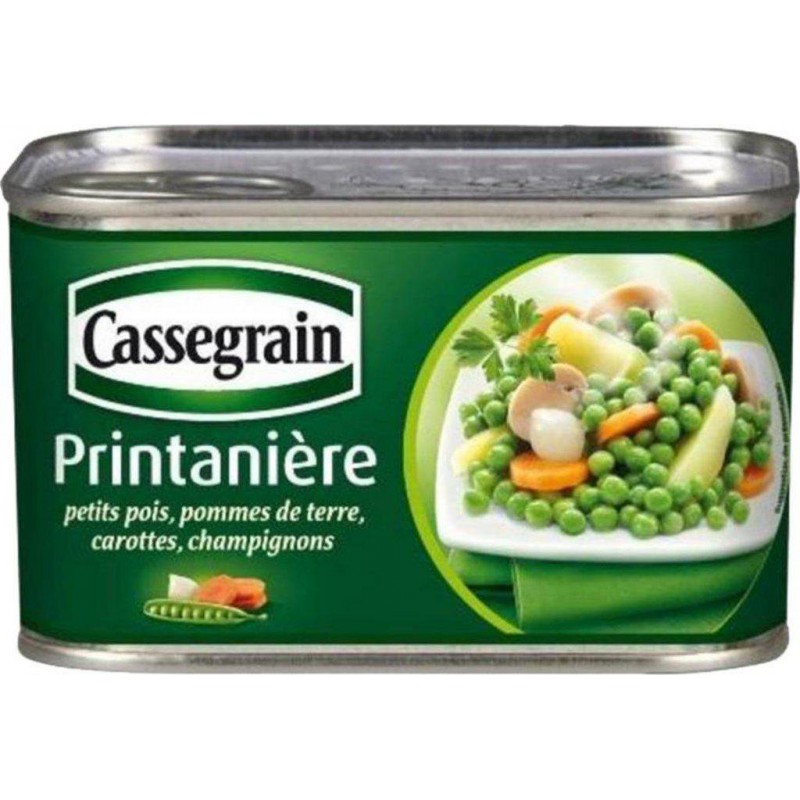 La Printanière de Légumes Cassegrain mérite bien son nom. Agrémentée de petits oignons grelots, fraîchement cueillis, cette recette est un vrai bouquet de fraîcheur. Finement relevée par de délicats aromates, elle révèle toute la saveur des légumes. Goûtez. Petits pois 53%, pommes de terre 20%, carottes en rondelles 15%, champignons de Paris émincés 10% et oignons 2%. Jus cuisiné: eau, sucre, sel, arômes (LACTOSE, GLUTEN, CELERI), vinaigre de vin blanc 7%. Produit unitaire EAN 3083680709132.