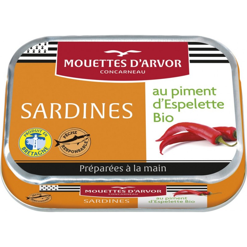 De 8 à 10 petites sardines au goût fin et délicat aromatisées au piment doux d'Espelette. SARDINES 75%, huile d'olive vierge extra 24%, sel, paprika piment d'Espelette 0,3%. 24,8% des produits d'origine agricole sont issus de l'Agriculture Biologique. Certifié FR-BIO-10. Produit unitaire EAN 3365624025066.