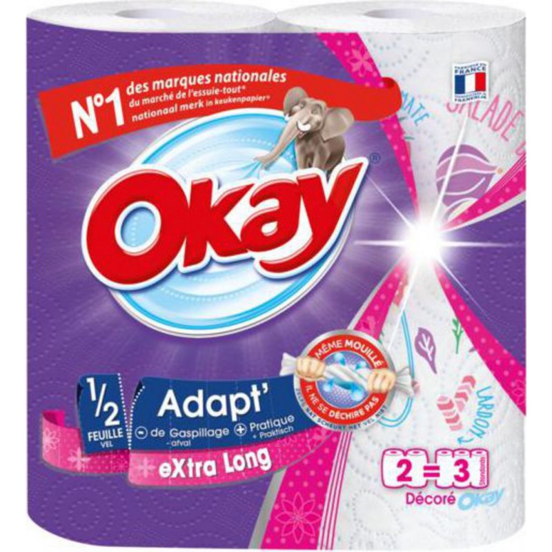 Avec sa ½ feuille et avec 50% de feuilles en plus qu’un rouleau Okay standard le rouleau Okay Adapt' Extra Long est pratique, économique et dure plus longtemps! Okay Adapt' Extra Long bénéficie aussi d'une performance unique: même mouillées, ses feuilles ne se déchirent pas. Produit unitaire EAN 7322541177434.