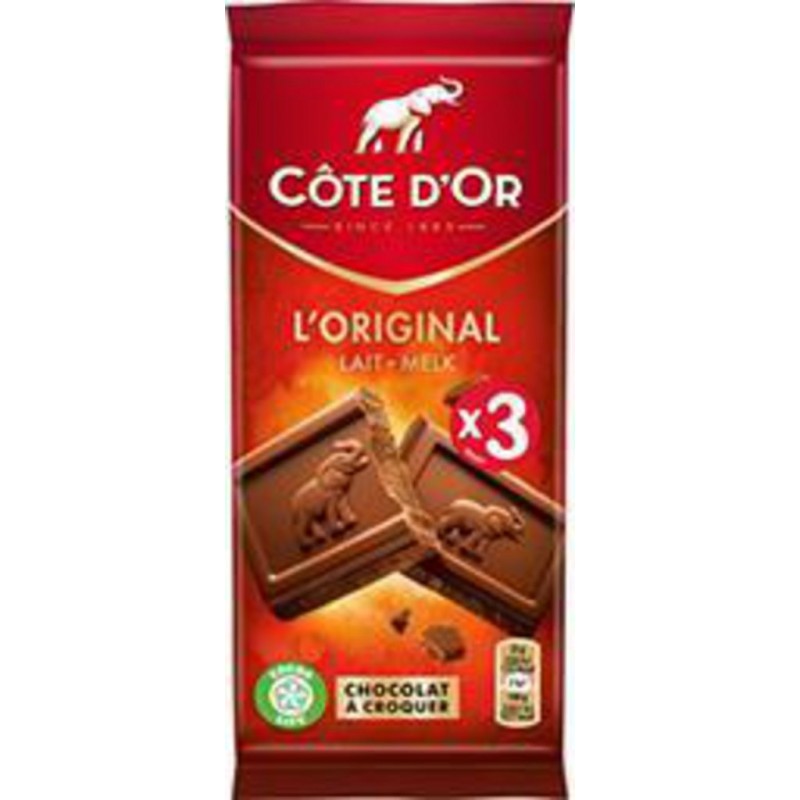 COTE DOR LAIT 3X100G CHOCOLATS TABLETTE TABLETTES FAMILIALES. ">Ingrédient(s): Sucre, pâte de cacao, poudre de LAIT écrémé, beurre de cacao, lactosérum en poudre (de LAIT), BEURRE concentré, émulsifiant (lécithine de SOJA), arômes. Cacao: 33% minimum. PEUT CONTENIR FRUITS À COQUE.