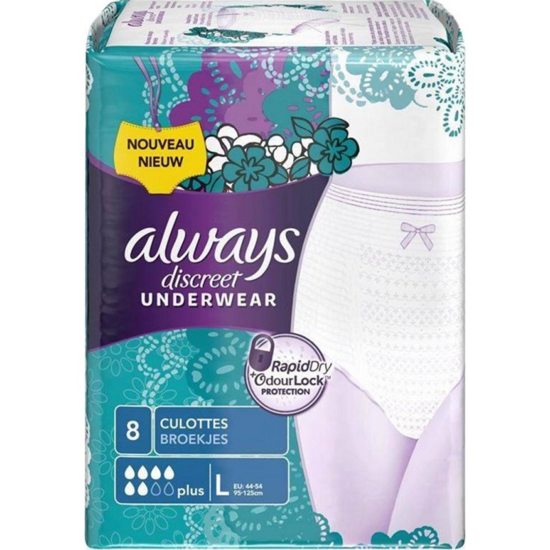 Culottes pour incontinence ALWAYS DISCREET PLUS Taille L. Ne laissez pas les fuites urinaires vous empêcher de vivre votre vie pleinement. Les culottes ALWAYS DISCREET PLUS pour fuites urinaires et incontinence restent bien en place et vous aident ainsi à vivre votre vie pleinement, même en cas de fuites urinaires importantes et inattendues. Lot économique de 16 culottes. La culotte hygiénique est approuvée dermatologiquement. Produit unitaire EAN 4015400884064, lot de 2 EAN 3701018039408.