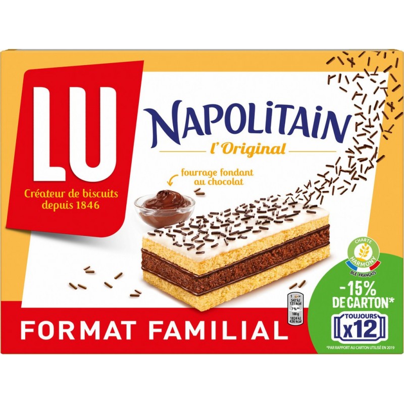 Napolitain Original, des génoises moelleuses et un fourrage fondant au chocolat, le tout recouvert de vermicelles craquants! 12 sachets individuels pour un transport facile. Farine de BLÉ 24%, sucre, huile de palme, sirop de glucose-fructose, OEUFS 7,5%, chocolat en poudre 6,5% (sucre, cacao en poudre), stabilisants (glycérol, sorbitol), lactosérum en poudre (de LAIT), amidons, sirop de glucose, arômes (contient alcool), cacao maigre en poudre, huile de colza, poudres à lever (carbonates d'ammonium, diphosphates, carbonates de sodium), beurre de cacao, sel, graisse de karité, LAIT écrémé en poudre, émulsifiants (E472b, E472a, lécithines de SOJA, E471, E473), épaississant (gomme xanthane), colorant (E160a), BEURRE concentré, correcteurs d’acidité (citrates de sodium, acide citrique, acide tartrique), conservateur (sorbate de potassium). PEUT CONTENIR FRUITS A COQUE. Produit unitaire EAN 7622201815516.