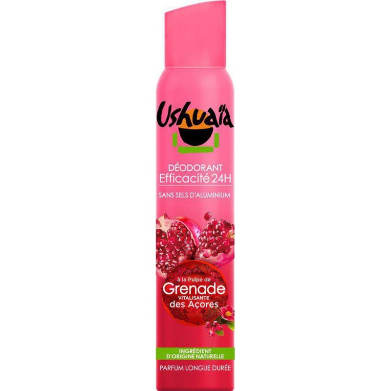 Aux Açores, au cœur de l’Océan Atlantique, la Recherche Ushuaïa a sélectionné la pulpe de Grenade aux vertus énergisantes, et l’a associé à une formule performante pour créer le déodorant Ushuaïa à la pulpe de Grenade des Açores. La recherche Ushuaïa a développé une formule déodorante efficace 24H, anti-traces et sans sels d’aluminium, pour vous proteger toute la journée contre les effets de la transpiration, dans le respect optimal de votre peau. Son délicieux parfum fruité et gourmand vous procure un plaisir intense et stimule les sens. Dès l’application une onde de fraîcheur vous envahit, tout au long de la journée vous êtes efficacement protégée et délicatement parfumée. isobutane,alcohol denat.,parfum / fragrance,triethyl citrate,aqua / water,glycerin,linalool,limonene,citric acid,benzyl alcohol,citronellol,geraniol,punica granatum extract,citral. Produit unitaire EAN 3600550809312.
