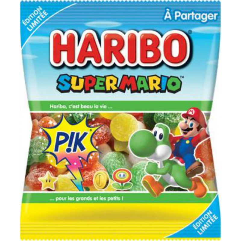 De délicieux bonbons à l’effigie de vos personnages préférés, des champignons, des fleurs ou encore des étoiles tout droit sorti de l’univers de Mario! Ingrédients: sirop de glucose; sucre; gélatine; dextrose; acidifiants: acide citrique, acide malique; agent d'enrobage: cire de carnauba; correcteurs d'acidité: citrate tricalcique, malate acide de sodium; arôme; concentrés de fruits et de plantes: carthame, spiruline, pomme, citron, radis. Tenir à l'abri de la chaleur et de l'humidité. Peut contenir des traces de blé, LAIT. Produit unitaire EAN 3103220062081.