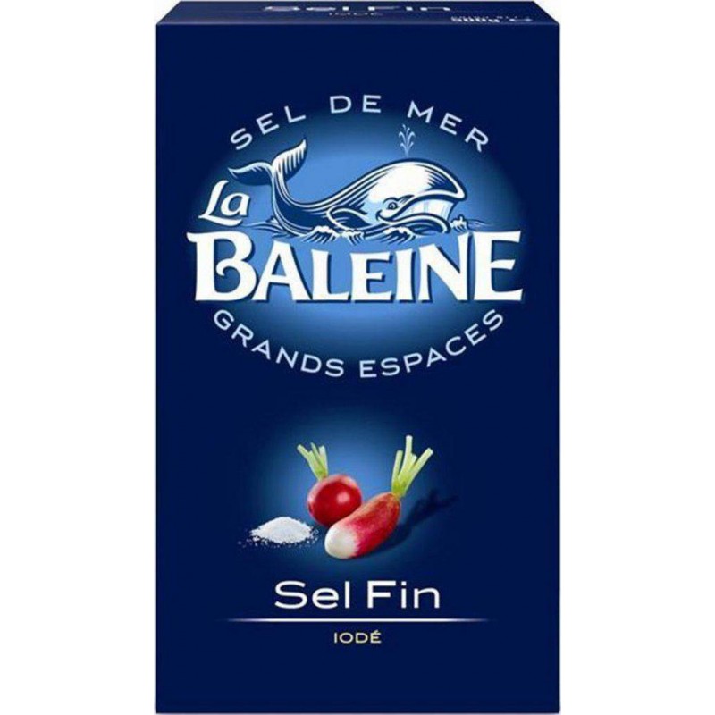 Relevez le goût de votre cuisine avec le sel fin de mer La Baleine naturellement Blanc. Lot économique de 20 cartons. Sel de mer, Iodure de Sodium: 15 à 20 mg/Kg (exprimés en élément iode), antiagglomérant: E535. Produit unitaire EAN 3183280000896, lot de 20 EAN 3701018083494.