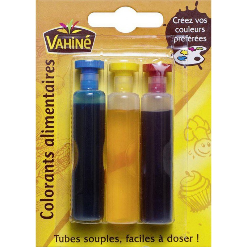 Utilisez les colorants et arômes alimentaires Vahiné pour booster votre créativité! 3 tubes de colorants liquides dans les couleurs bleu, jaune et rouge. Avec ces trois couleurs primaires, vous pourrez composer à l'infini la couleur de vos gâteaux. Lot économique de 9 tubes. eau, colorants (rouge: E122, jaune: E102, bleu: E133), acidifiant: acide citrique, conservateur: E202. Produit unitaire EAN 3179140633458, lot de 3 EAN 3701018087591.