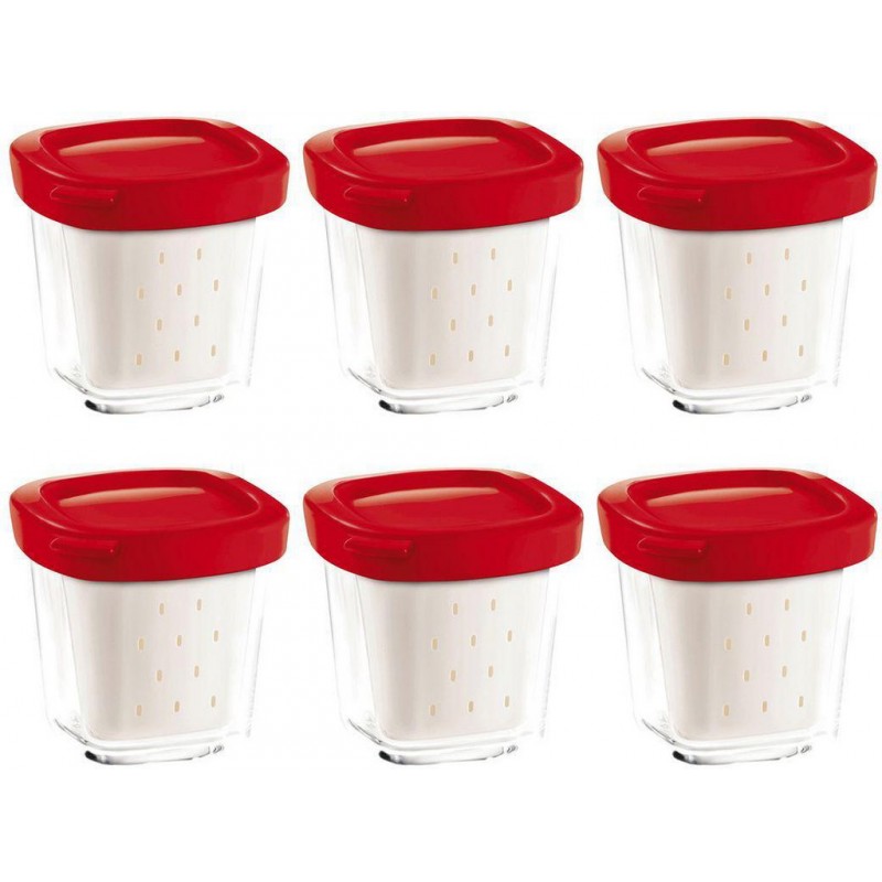 Lot de 6 pots de yaourts pour yaourtière Multi délices couleur rouge. Compatibilité de modèle Yaourtières Multi-délices, Multi-délices Express, Multi-délices Compact. 6 x 140ml, 6 couvercles et 6 égouttoirs amovibles, Lavables au lave-vaisselle. Produit unitaire EAN 3045380015005.