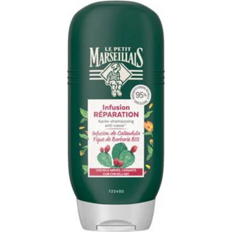 INFUSION REPARATION APRES SHAMPOOING. ABIME & CASSANT & CUIR CHEVELU SEC. Aqua, cetearyl alcohol, glycerin, behentrimonium chloride, oleic/linoleic/linolenic polyglycerides, calendula officinalis flower extract, opuntia ficus indica seed oil, isopropyl alcohol, ceteareth-20, citric acid, sodium benzoate, parfum, benzyl salicylate, alpha-isomethyl ionone. Cet ingrédient est utilisé comme agent conditionnant pour les cheveux. sans silicone. Produit unitaire EAN 3574661598987.