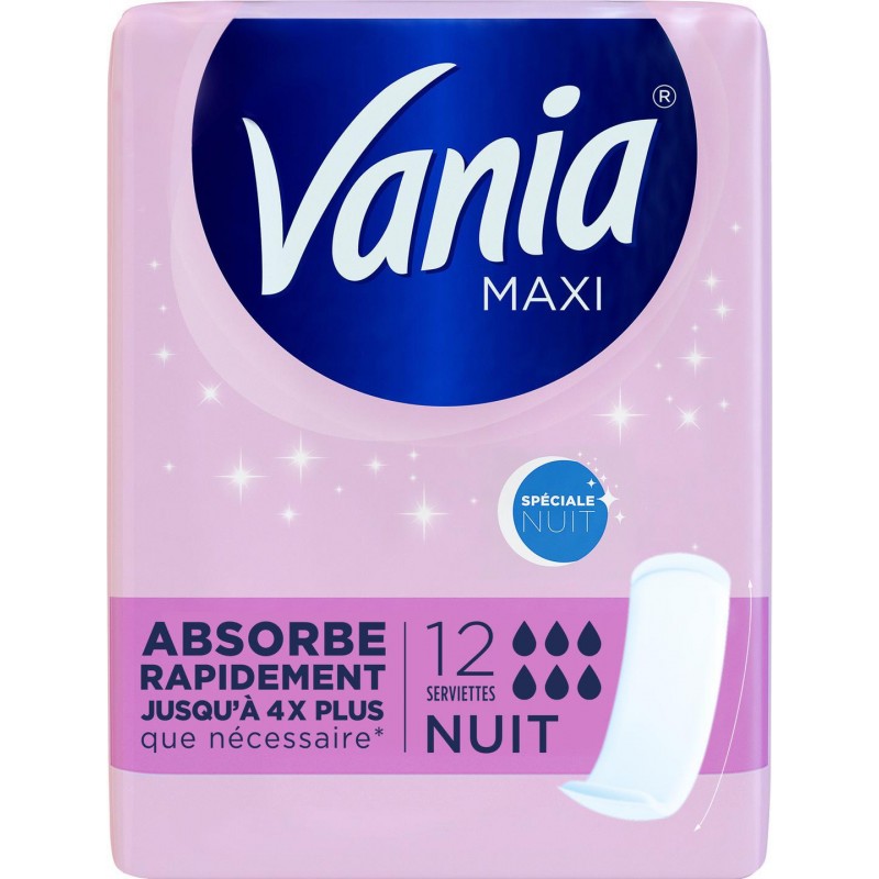 Absorbe rapidement jusqu'à 4x plus que nécessaire* Les serviettes Vania® Maxi Nuit vous offrent une protection optimale! Grâce à une technologie ultra absorbante et un adhésif ultra performant, les serviettes Vania® Maxi Nuit absorbent rapidement jusqu'à 4 fois plus que nécessaire* et restent parfaitement en place. Ultra souples, les serviettes Vania® Maxi Nuit disposent d'un voile micro-aéré testé dermatologiquement pour un confort optimal la nuit. Longueur spéciale nuit Voile testé dermatologiquement Absorption rapide Ultra souple *Basé sur les performances d'absorption des serviettes et sur les données moyennes de flux menstruel, considérant que les serviettes sont changées régulièrement. Chaque femme est unique et vos règles peuvent évoluer chaque mois. Vania® vous aide à choisir la serviette la plus adaptée à vos besoins: Flux normal Maxi Normal - Absorption: 2/6 Flux normal Maxi Normal - Absorption: 3/6 Flux abondant Maxi Super - Absorption: 4/6 Flux abondant Maxi Super - Absorption: 5/6 Flux nocturne Maxi Nuit - Absorption: 6/6 Flux nocturne Maxi Nuit - Absorption: 6/6 Les serviettes Maxi Confort Super existent aussi en version Fresh & Aloe Vera. Lot économique de 8 paquets. Produit unitaire EAN 3574661419435, lot de 8 EAN 3665816039469.
