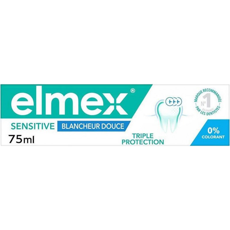 Elmex Sensitive Blancheur est un dentifrice spécifique pour la protection quotidienne des dents sensibles. Ne pas utiliser chez l'enfant de moins de 7 ans. Aqua, hydrated Silica, sorbitol, Glycerin, Hydroxyethylcellulose, Olaflur, Aroma, Limonene, CI 77891, Cocamidopropyl Betaine, Sodium Saccharin, Hydrochloric Acid. Produit unitaire EAN 8718951544840.