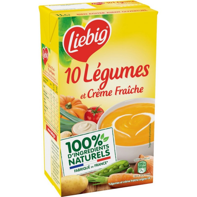 100% d'ingrédients naturels C'est quoi? ✓ des bons légumes ✓ de l'eau ✓ des ingrédients naturels Et c'est tout! Sans colorant Sans conservateur² Sans exhausteur de goût Riche en Légumes ²Conformément à la réglementation. Petits pois Tomate Pomme de terre Panais Céleri Poireau Carotte Céleri-rave Oignon Potiron Qualité Garantie Nos légumes sont sélectionnés avec soin et cueillis à maturité. Riches de 30 ans de savoir-faire, nous les cuisinons dans notre usine près d'Avignon en Provence. Pour garantir leur conservation sans aucun ajout de conservateur, nos soupes sont chauffées à haute température avant d'être mises en brique. Notre équipe qualité contrôle quotidiennement nos soupes afin de garantir les meilleurs produits. eau,carotte,jus de tomates à base de concentré,pomme de terre,CRÈME fraîche 4,7%,oignon,amidon de maïs,BEURRE de cuisine,potiron,panais,CELERI,petit pois,CELERI-RAVE,poireau,sel,arômes naturels (contient LAIT). Peut contenir des traces de blé (GLUTEN) et ŒUF. Produit unitaire EAN 3036811367770.