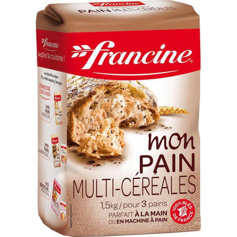 Pour réussir soi-même de bons pains au goût équilibré de seigle, de sésame et de tournesol, en machine à pain ou à la main. Associée à la levure boulangère Francine, c'est le secret d'un pain bien levé et gourmand! Farine de blé, graines de tournesol, farine de seigle (origine UE), graines de lin brun, gluten de blé (origine UE), levain de blé déshydraté et désactivé, émulsifiant: E472e, dextrose, malt d’orge (origine UE), agent de traitement de la farine: E300, enzyme. Céréales: 84%. Présence éventuelle d’œuf, de soja, de graines de sésame, de lait et de fruits à coque. Produit unitaire EAN 3068111450234.