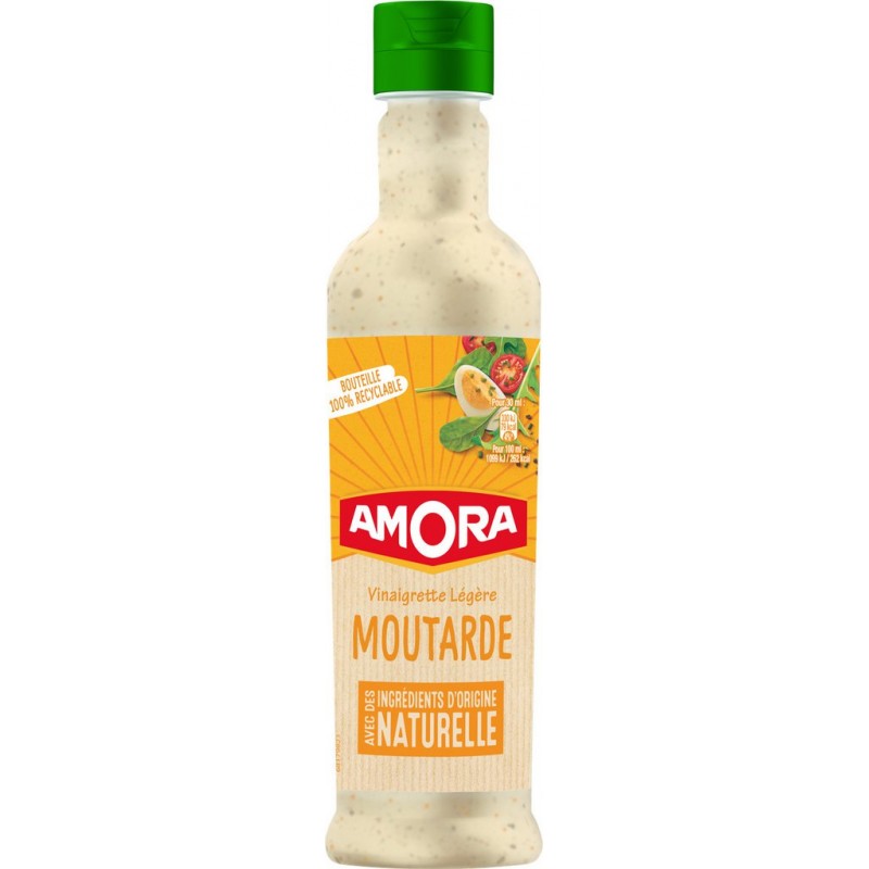 Amora, par amour du goût. Amora met sa passion du goût à votre service pour vous proposer des produits de qualité qui sauront relever tous vos plats. Parce qu’Amora sait que la qualité des produits est au cœur des préoccupations des mamans, Amora s'engage à offrir des produits dont toutes les saveurs sont préservées... Présente dans le cœur des français depuis 1934, Amora continue de séduire chaque année avec des nouveautés simples, goûteuses et originales. Reconnue et appréciée pour son savoir-faire et la qualité de ses produits, réalisez des recettes faciles, gourmandes, savoureuses et réinventez vos plats en leur donnant toujours plus de goût avec Amora. Sur le bord de l'assiette, dans vos sandwichs, ou à chaud, les produits Amora assaisonneront et relèveront les saveurs de votre cuisine. Découvrez ainsi le plaisir de partager de délicieux repas en famille ou entre amis. Retrouvez toutes les astuces et les recettes faciles et gourmandes Amora: vous régalerez les grands comme les petits, pour le plaisir de toutes les papilles... Venez découvrir les vinaigrettes Amora, avec la vinaigrette césar ou nature, ou les vinaigrettes légères nature ou moutarde! eau, huile de colza 25%, vinaigre de vin rouge, MOUTARDE à l'ancienne 8% (eau, graines de MOUTARDE, vinaigre d'alcool, sel, curcuma), amidon de maïs, miel, sel, arôme naturel de MOUTARDE, poivre noir, jus de citron concentré, sucre, concentré de carthame. Peut contenir: SESAME. d'origine naturelle. Produit unitaire EAN 8711200459995.