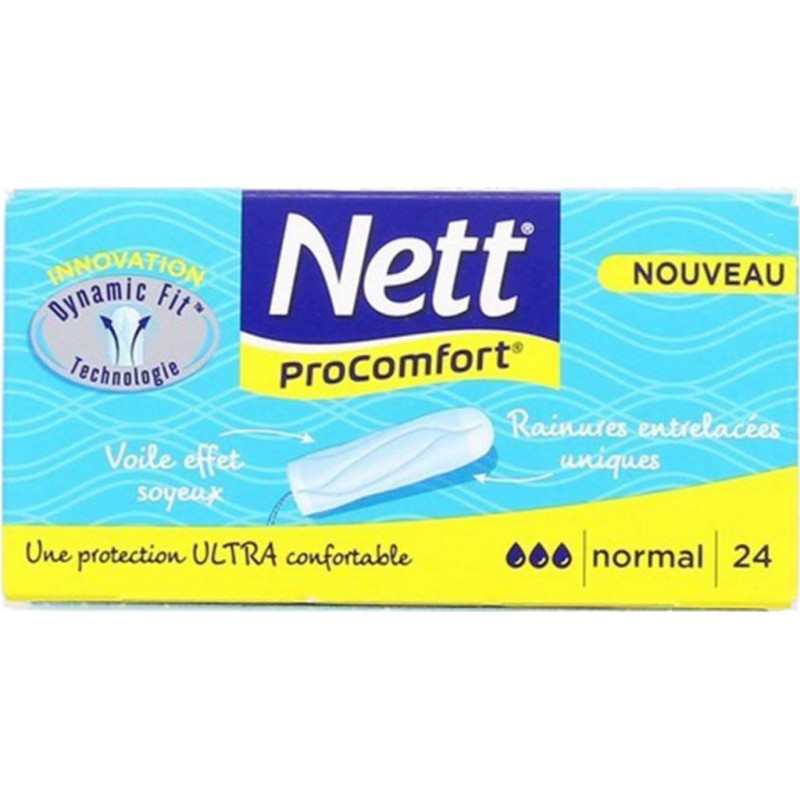Les tampons NETT® PROCOMFORT® sont conçus pour vous offrir quatre atouts en un: un voile effet soyeux unique qui permet une insertion et un retrait faciles tout en douceur, - une Technologie Stay Dry qui aide la cordelette à rester sèche et propre - une ouverture en COROLLE® qui permet une adaptation en douceur à votre corps pour recueillir le flux au plus près de votre anatomie - des rainures incurvées qui dirigent le flux plus efficacement au cœur du tampon. Lot économique de 96 tampons. NETT® PROCOMFORT® Normal est un tampon à 3 gouttelettes, spécialement adapté aux femmes ayant un flux moyen à abondant. Produit unitaire EAN 3574661350639, lot de 4 EAN 3701018096982.