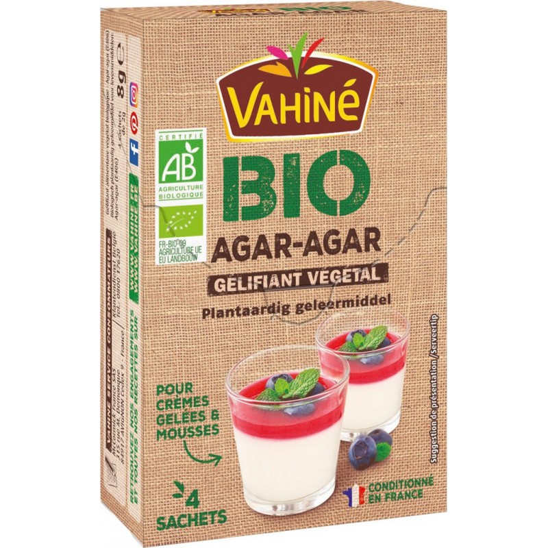 L’Agar Agar Vahiné BIO est un gélifiant 100% végétal, sans colorant, ni conservateur. Il est constitué d’extraits d’algues marines réduites en poudre, inodores et incolores. D’un geste simple, il apportera texture et fondant à tous vos desserts. RECETTESBIO INÉDITES AU DOS DE VOS SACHETS. logo: PENSEZ AU TRI!ÉTUI CARTON ET SACHETS À RECYCLER CONSIGNE POUVANT VARIER LOCALEMENT> WWW.CONSIGNESDETRI.FR VALABLE UNIQUEMENT EN FRANCE. Bioagar-agar. Produit unitaire EAN 3179142058389.
