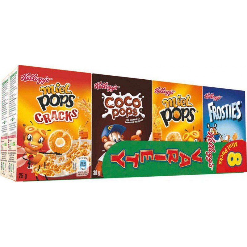 Des délicieuses céréales croustillantes, rien de tel que Miel Pops de Kellogg’s! Coco Pops, Miel Pops Cracks et Frosties. Format idéal pour emporter tes petites boîtes préférés partout! Lot économique de 24 mini paquets. Identique aux recettes de Chocos / Miel Pops Cracks / Miel Pops Coco Pops: Riz, sucre, chocolat (4%) (sucre, pâte de cacao), cacao maigre en poudre, sel, arôme de malt d'orge, arôme, Vitamines et Minéraux: carbonate de calcium, vitamines (PP, B6, B2, B1, B9, D, B12), fer. Frosties: Maïs, sucre, arôme de malt d'orge, sel, Vitamines et Minéraux: vitamines (PP, B6, B2, B1, B9, D, B12), carbonate de calcium, fer. Produit unitaire EAN 3159470005347, lot de 3 EAN 3701018067074.