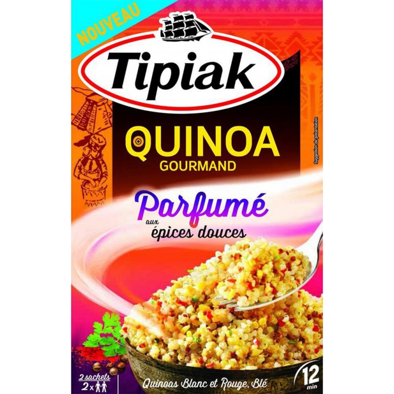 Tipiak redécouvre pour vous la cuisine ancestrale d'Amérique du Sud du quinoa, appelé riz des Incas, et s'en inspire pour créer une recette unique, gourmande et authentique. Lot économique de 8 sachets. Quinoas (blanc et rouge) (55%), BLE dur précuit (GLUTEN (16%), semoule de BLE dur précuite (GLUTEN) (15%), pépites de LUPIN, huiles végétales (tournesol et olive), maltodextrine, plantes aromatiques, sel, arômes naturels (LAIT, LACTOSE), poivrons rouges déshydratés, épices (MOUTARDE) (0,6%), fécule, poudre d’oignon, sucre, poudre d’ail. Produit unitaire EAN 3600900020497, lot de 4 EAN 3701018089816.