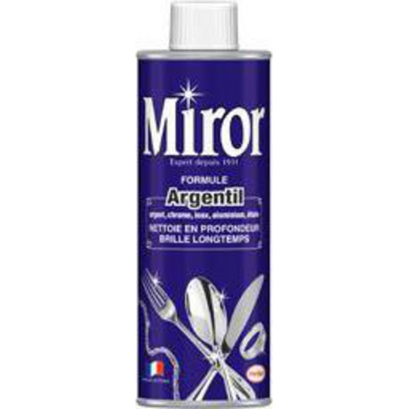Miror Formule Argentil nettoie à fond et fait briller durablement l'argent, le chrome, l'inox, l'étain brillant, le nickel, l'aluminium et l'acier. Grâce à une formule anti-oxydante, Miror protège vos métaux et retarde la réoxydation pendant plusieurs mois. La Formule Argentil est aussi recommandée pour nettoyer les tringles de rideaux, les fenêtres en aluminium, les poignées de portes et les tubes d'ameublement. ">Contient entre autres composés (règlement détergent (CE) n°648/2004): moins de 5%: agents de surface non-ioniques, hydrocarbures aliphatiques, savon.