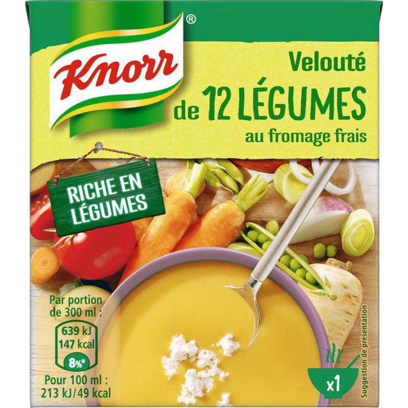 Pour vous concocter cette soupe, les chefs Knorr® ont habilement marié douze délicieux légumes et les ont associés au fromage frais, pour une saveur délicieuse et une texture onctueuse. Eau, carotte: 8,9%, pomme de terre: 6,9%, tomate: 6,6%, potiron: 4,4%, FROMAGE frais: 2,9%, oignon: 2,8%, CELERI-RAVE: 2,1%, petit pois: 2,1%, haricot vert: 2,1%, poireau: 2%, amidon modifié de maïs, sucre, panais: 1,1%, courgette: 1,1%, navet: 1,1%, huile de tournesol, sel, graisse de poule, lactosérum (LAIT), arôme, extrait de levure, LAIT écrémé en poudre, ail. Peut contenir: GLUTEN, MOUTARDE, ŒUF. Légumes issus de l'agriculture durable. Produit unitaire EAN 8710908953767.