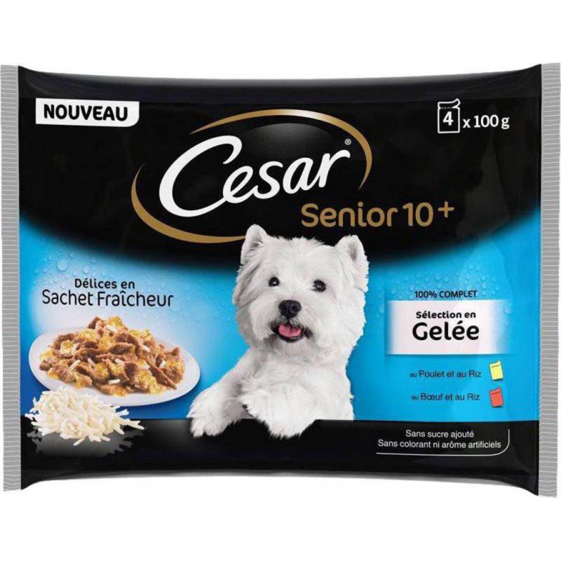 Aliment complet pour chiens seniors à partir de 10 ans - 2 variétés en sauce (Au Poulet et au Riz / Au Boeuf et au Riz). Les sachets fraîcheur Cesar Senior offrent des recettes succulentes que votre chien va adorer, spécialement élaborées pour ses besoins, en favorisant une bonne digestion. Cesar Senior 10 , ce sont des recettes élaborées avec amour, 100% complètes et équilibrées, des repas sains et délicieux pour lui faire plaisir tous les jours, des recettes de qualité préparées avec des ingrédients soigneusement sélectionnés. Sans sucre ajouté. Sans arôme ni colorant artificiels ajoutés. Nos recettes contiennent les nutriments, les vitamines et les minéraux essentiels, et favorisent une bonne digestion. Les sachets fraîcheur Cesar sont parfaits pour un délicieux repas fraîchement servi! Disponibles en format 4x100g. Au poulet et au Riz: Viandes et sous-produits animaux (45%, dont poulet 4%), CEREALES (dont riz 4%), substances minérales, sous-produits d'origine végétale. Au boeuf et au Riz: Viandes et sous-produits animaux (45%, dont boeuf 4%), CEREALES (dont riz 4%), substances minérales, sous-produits d'origine végétale. Produit unitaire EAN 5900951253744.