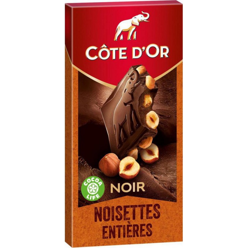 Côte d'or Noir Noisettes: goûtez à la puissance du chocolat noir Côte d'or allié au croquant de délicieuses noisettes entières. Un chocolat généreux pour des sensations gourmandes et intenses! Lot de 6 tablettes de chocolat noir Côte d'Or aux noisettes entières. Lot économique de 6 tablettes. Sucre, pâte de cacao, NOISETTES (24%), beurre de cacao, BEURRE concentré, émulsifiant (lécithine de SOJA), arôme, LAIT écrémé en poudre. Cacao: 46% minimum dans le chocolat noir extra-supérieur. PEUT CONTENIR AUTRES FRUITS A COQUE. Produit unitaire EAN 7622210995087, lot de 6 EAN 3665816027442.