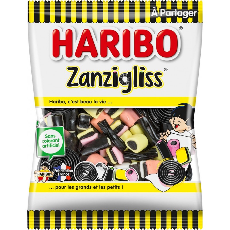 Ingrédients: sirop de sucre mélassé; sucre; farine de BLÉ; sirop de glucose; amidon; dextrose; graisse de palme; extrait de réglisse (0,9%); maltodextrine; sel; gélatine; acidifiant: acide citrique; concentrés de fruits et de plantes: carthame, spiruline, betterave rouge; sirop de sucre inverti; arôme; colorant: curcumine; agents d'enrobage: cire d'abeille blanche et jaune, cire de carnauba. Tenir à l'abri de la chaleur et de l'humidité. Peut contenir des traces de LAIT. Lot économique de 6. Produit unitaire EAN 3103220025956, lot de 6 EAN 3665816034167.