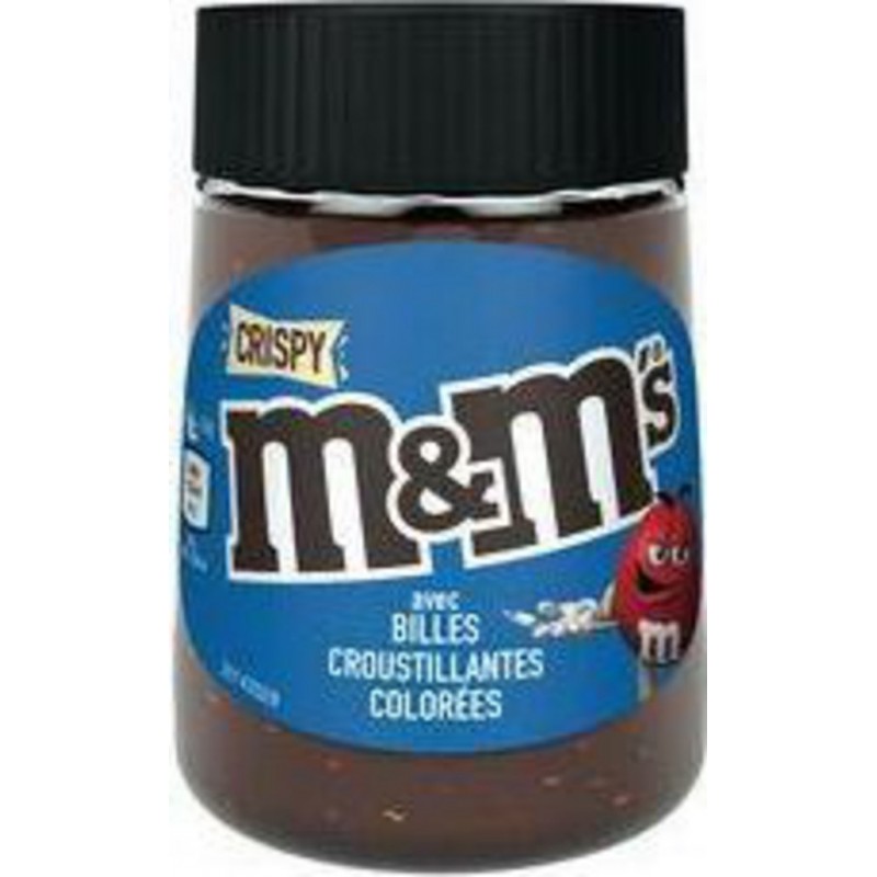 Avis aux amateurs de chocolat M&M's et de croustillant, voici la pâte à tartiner M&M's Crispy! Retrouvez tout le goût des chocolats M&M's dans cette onctueuse pâte à tartiner avec des grains de riz soufflé. A déguster directement à la cuillère ou en tartine sur un morceau de pain. Idéal pour un goûter délicieusement gourmand! sucre, huiles végétales (colza, palme), LAIT écrémé en poudre, cacao maigre en poudre (5,5%), NOISETTES (5%), billes croustillantes colorées (4%) (farine de riz, farine de BLÉ enrichie (farine de BLÉ, carbonate de calcium, fer, niacine, thiamine), huile de karité, huile de palme, concentrés alimentaires (carthame, spiruline, pomme, radis, cassis, citron, paprika, carotte), dextrose, huile de colza, émulsifiant (lécithines de SOJA)), lactose (LAIT), lactosérum en poudre (LAIT), émulsifiant (lécithines de tournesol), arôme naturel. Peut contenir d'autres fruits à coque. Allergènes Lait, noisettes, blé, soja. Produit unitaire EAN 5056357903407.