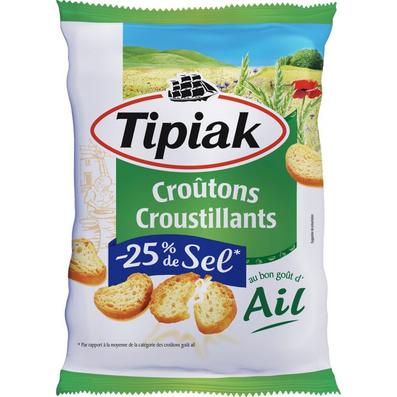 Croûtons -25% de sel au bon goût d'ail, juste bien dorés au four: une recette unique et gourmande à la mie aérée pour encore plus de croustillance et de plaisir! Farines (82,9%) (Farine de BLE (GLUTEN), farine complète de BLE (GLUTEN), farine de riz, farine complète de SEIGLE (GLUTEN), farine complète de maïs, farine complète d'ORGE (GLUTEN)), huile de tournesol, arôme naturel d'ail 2,5%, sel, son de BLE (GLUTEN), levure, levure sèche. Traces possibles de LAIT. Produit unitaire EAN 3185200001112.