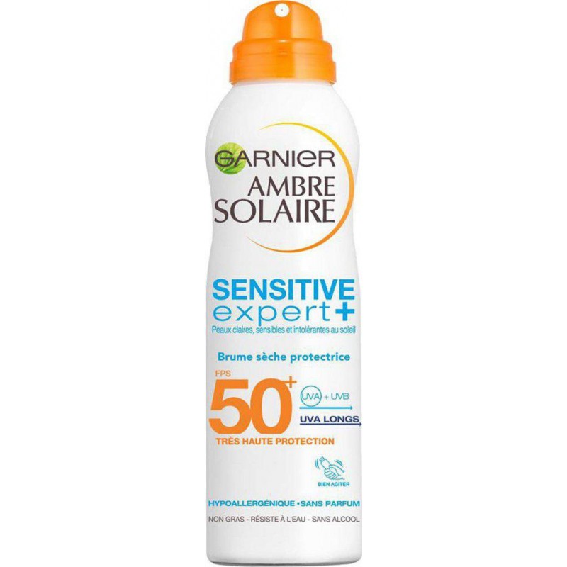 Garnier Ambre Solaire Sensitive Expert Brume Sèche Protectrice Très Haute Protection FPS 50 : la protection renforcée contre les UVA longs, pour les peaux claires, sensibles et intolérantes au soleil. Lot économique de 2 brumes. Hypoallergénique. Sans parfum. Non gras. Résiste à l'eau. Produit unitaire EAN 3600541603004, lot de 2 EAN 3701018093714.